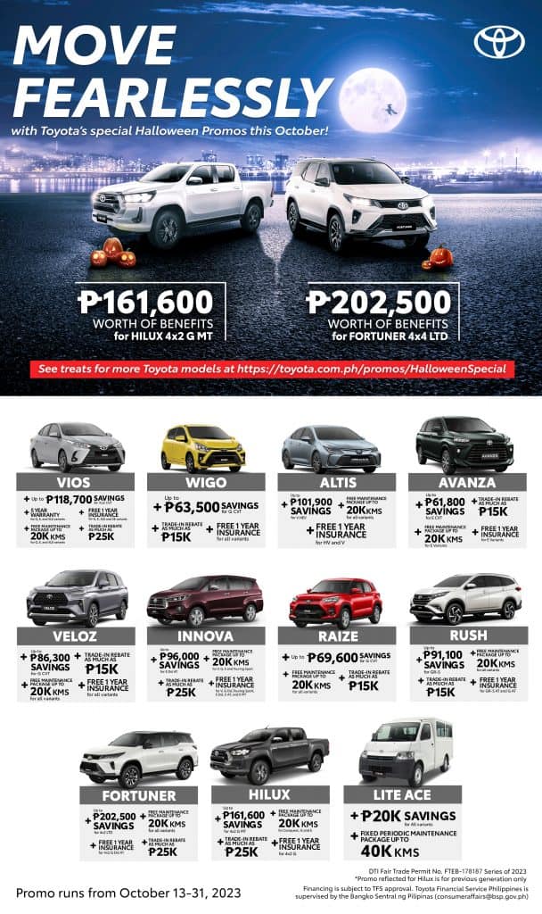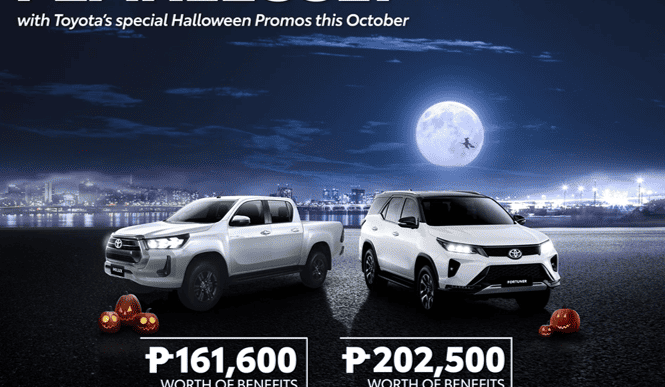 Toyota Motor Philippines (TMP) is welcoming this spooky season fearlessly with big deals and offers. Low monthly plans, trade-in rebates, and more deals are in store for you with TMP’s special Halloween deals available on all Toyota dealerships nationwide, until October 31, 2023.