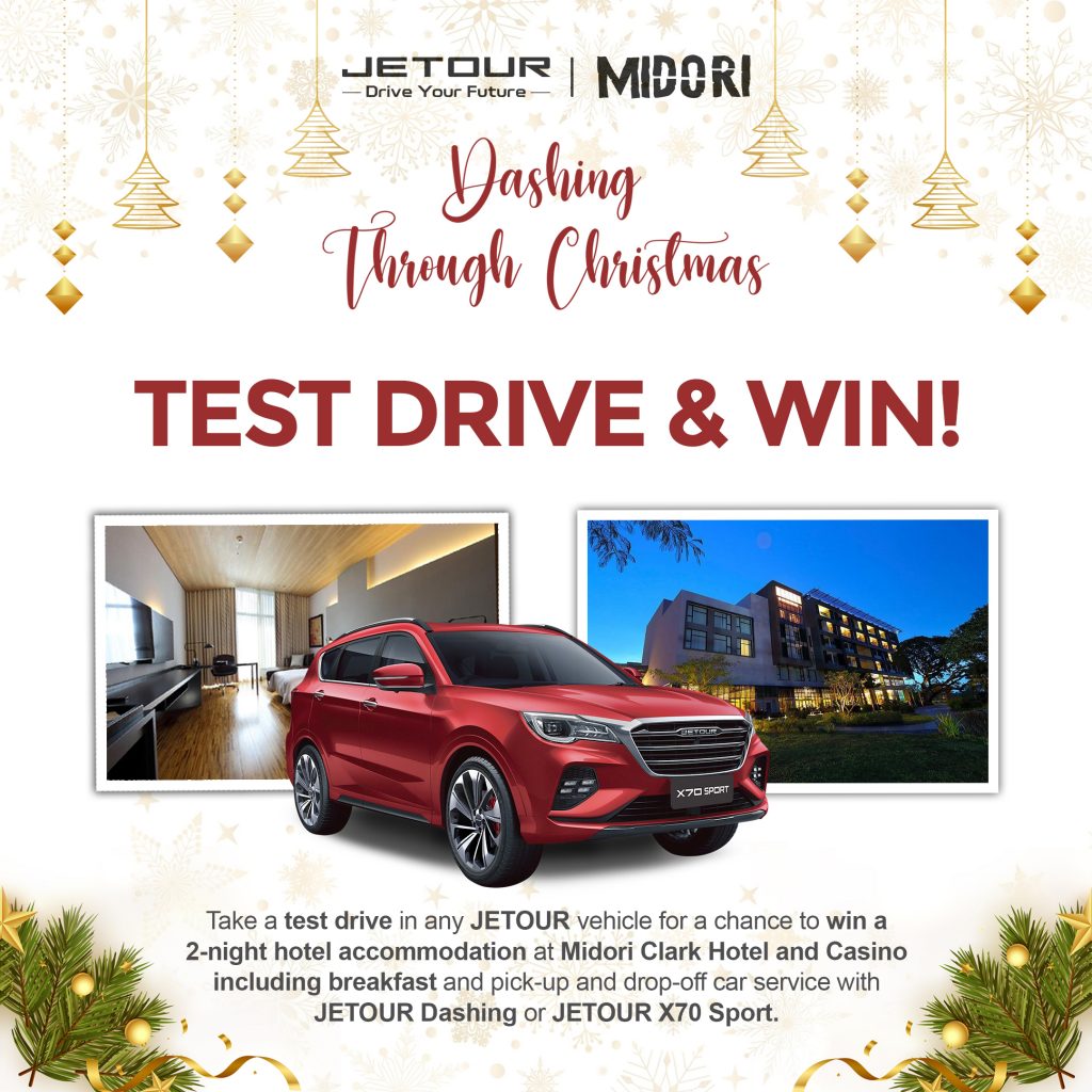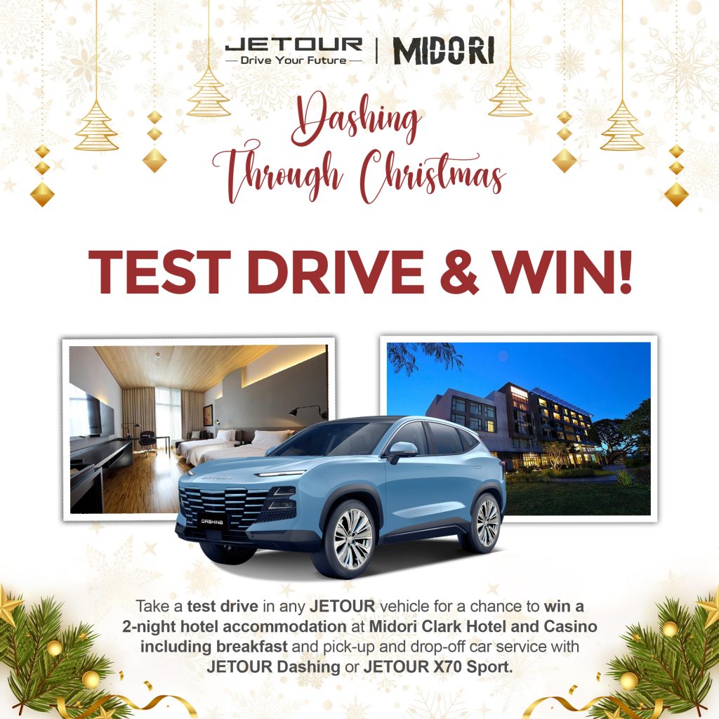 JETOUR Auto Philippines and Midori Clark Hotel and Casino come together to make the Holiday Season all the more memorable with the “Dashing Through the Christmas” raffle promo, where lucky winners will get a chance to experience a luxurious two-night staycation for two at Midori Clark Hotel and Casino complete with a complimentary JETOUR vehicle service.