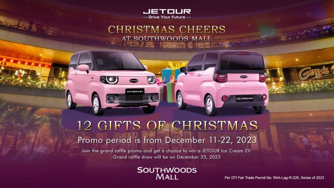 From December 11 to 22, 2023, shoppers at Megaworld’s Southwoods Mall who make a single or accumulated purchase of Php 2,000 at any of its stores will be entitled to one raffle coupon. There will be 12 raffle prizes, with winners to be drawn on December 23, 2023. A lucky shopper could win a brand-new JETOUR Ice Cream EV as the Grand Prize for the promotion.