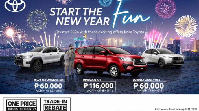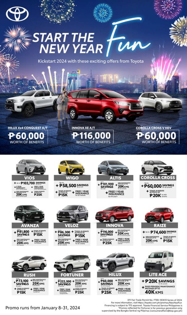 Start the New Year with a vehicle that’s sure to bring in the fun! Promo runs from January 8 to 31, 2024 only. Check out the full mechanics, offers and participating models here: https://toyota.com.ph/promos/NewYearFun