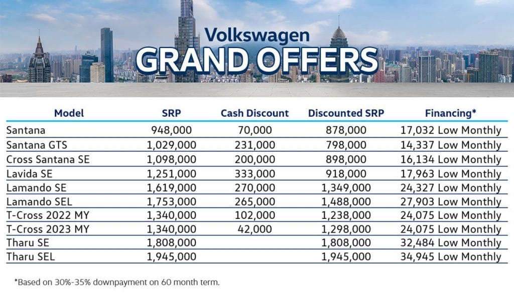 Starting this month, Volkswagen Grand Offers will let customers own the latest Volkswagen models through affordable down payments, save money with remarkable discounts, or opt for low monthly payments across the Volkswagen Philippines model range.