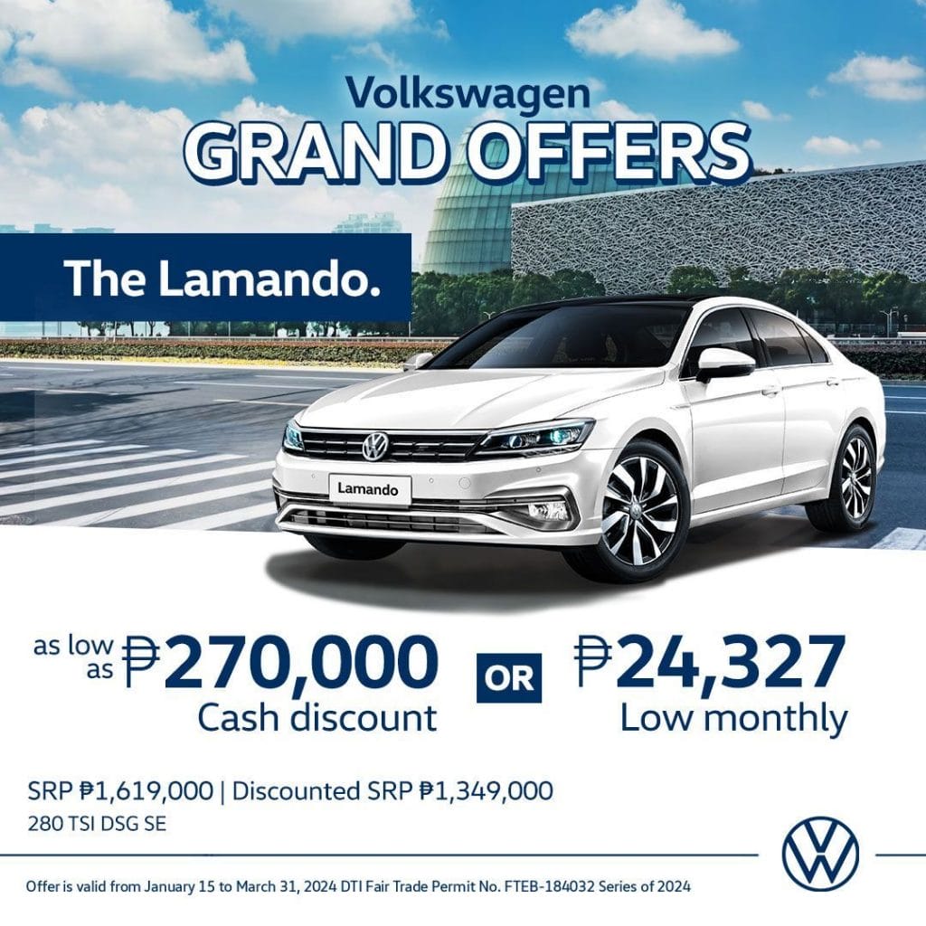 Benefits likewise await Volkswagen Lamando customers with up to PHP 270,000 savings off its SRP under the Volkswagen Grand Offers promotion. An optional PHP 24,327 monthly scheme is available for those purchasing the German-engineered premium sedan.