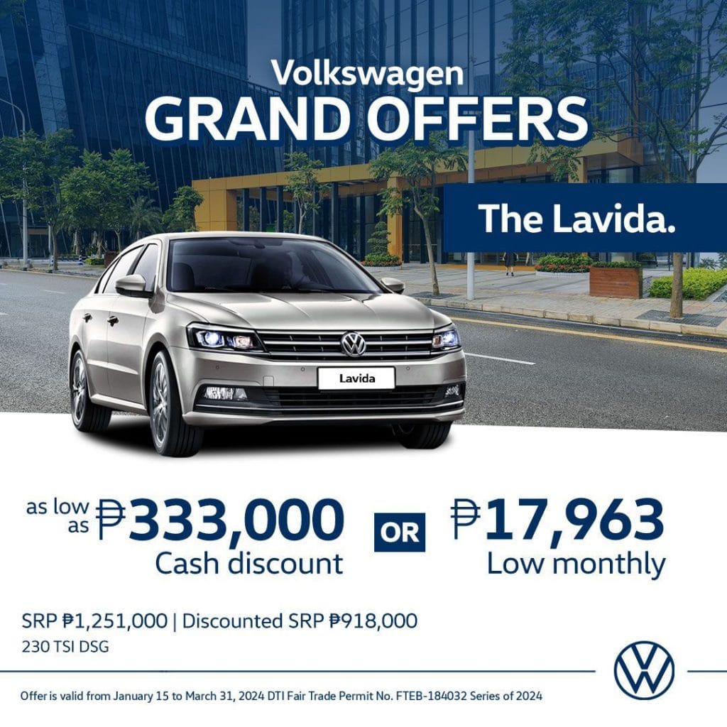Significant savings await buyers of the Volkswagen Lavida 230 TSI DSG SE. Volkswagen Philippines now offers the fuel-efficient family sedan with up to PHP 333,000 savings and a net price of PHP 918,000. A low monthly payment of PHP 17,963 is also available for the Lavida.
