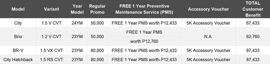 Customers can get an additional PHP10,000 discount on top of existing offers for every reservation and purchase of a Honda BR-V, New Brio, or New City. This can be availed through any of the participating bank partners, namely BPI, BDO, RCBC, PS Bank, Security Bank, China Bank, East West, PNB, Bank of Commerce, Maybank and Philtrust Bank. Please see the table below for more information.