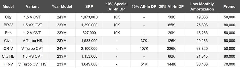 For more savings, customers interested in purchasing an All-New BR-V, New Brio, or New City can get up to two-months free amortization with a fixed 20% downpayment at 60-months payment terms.