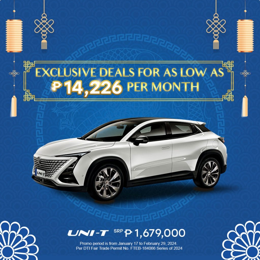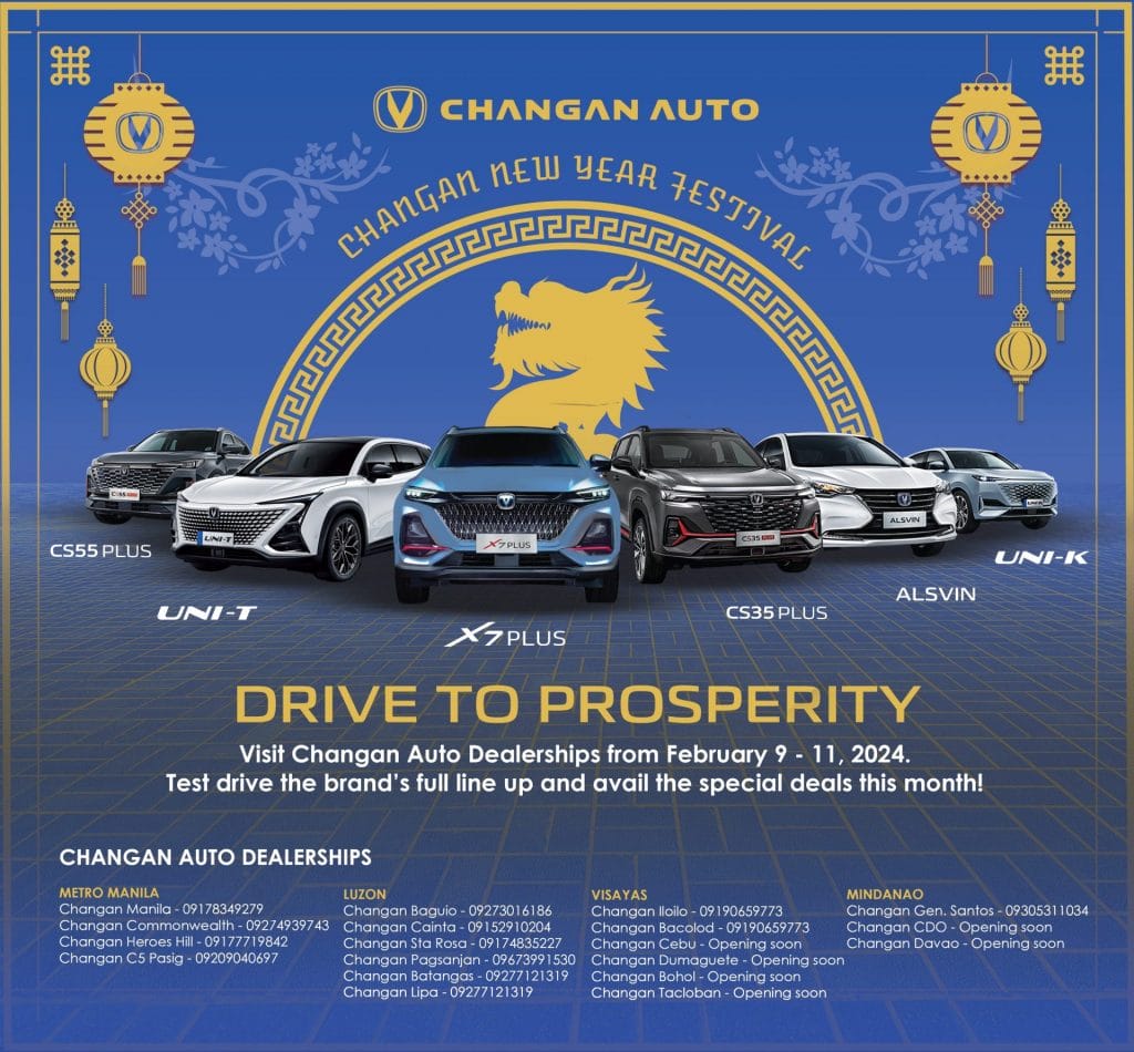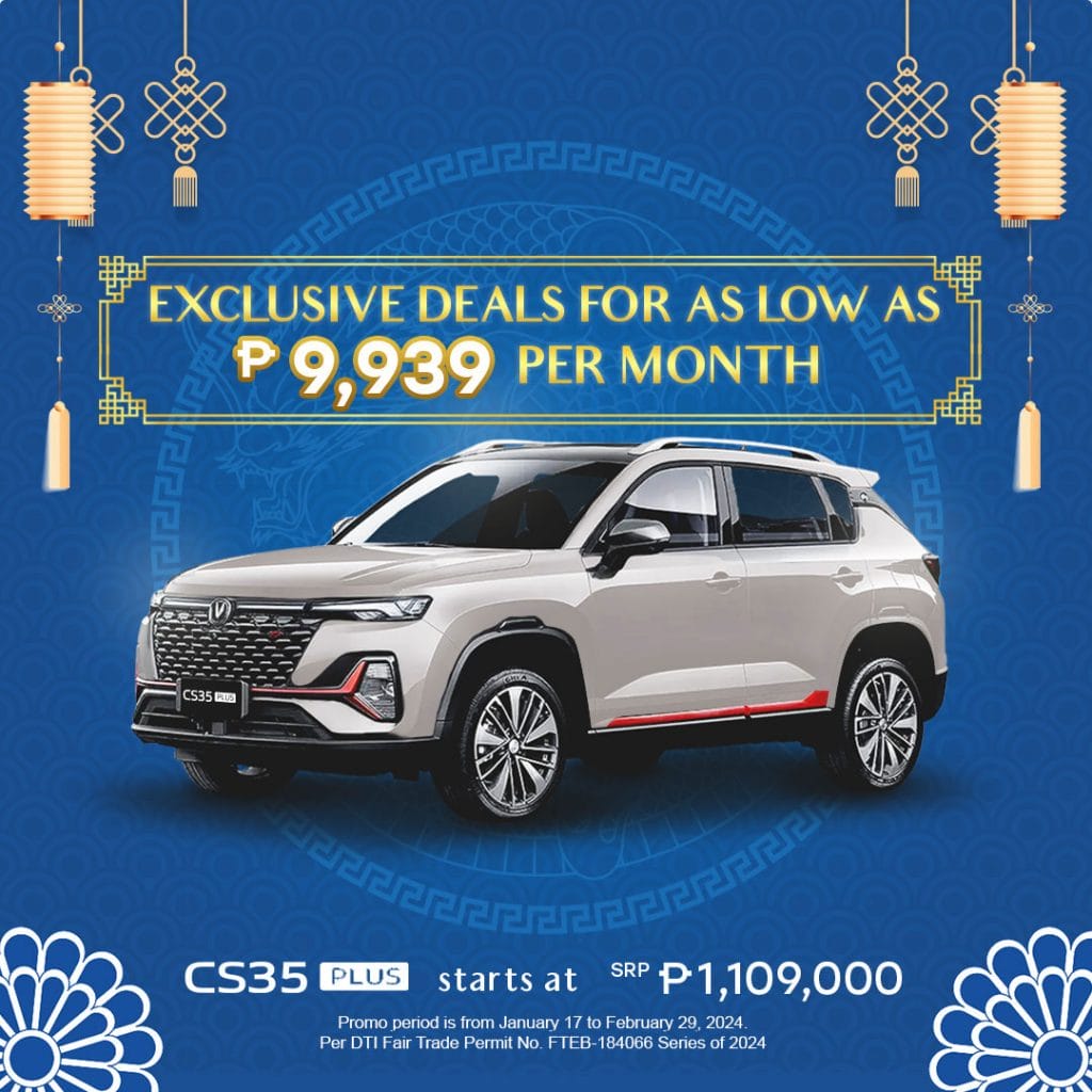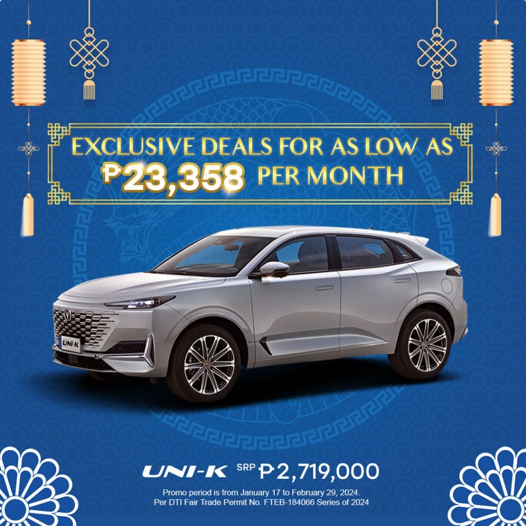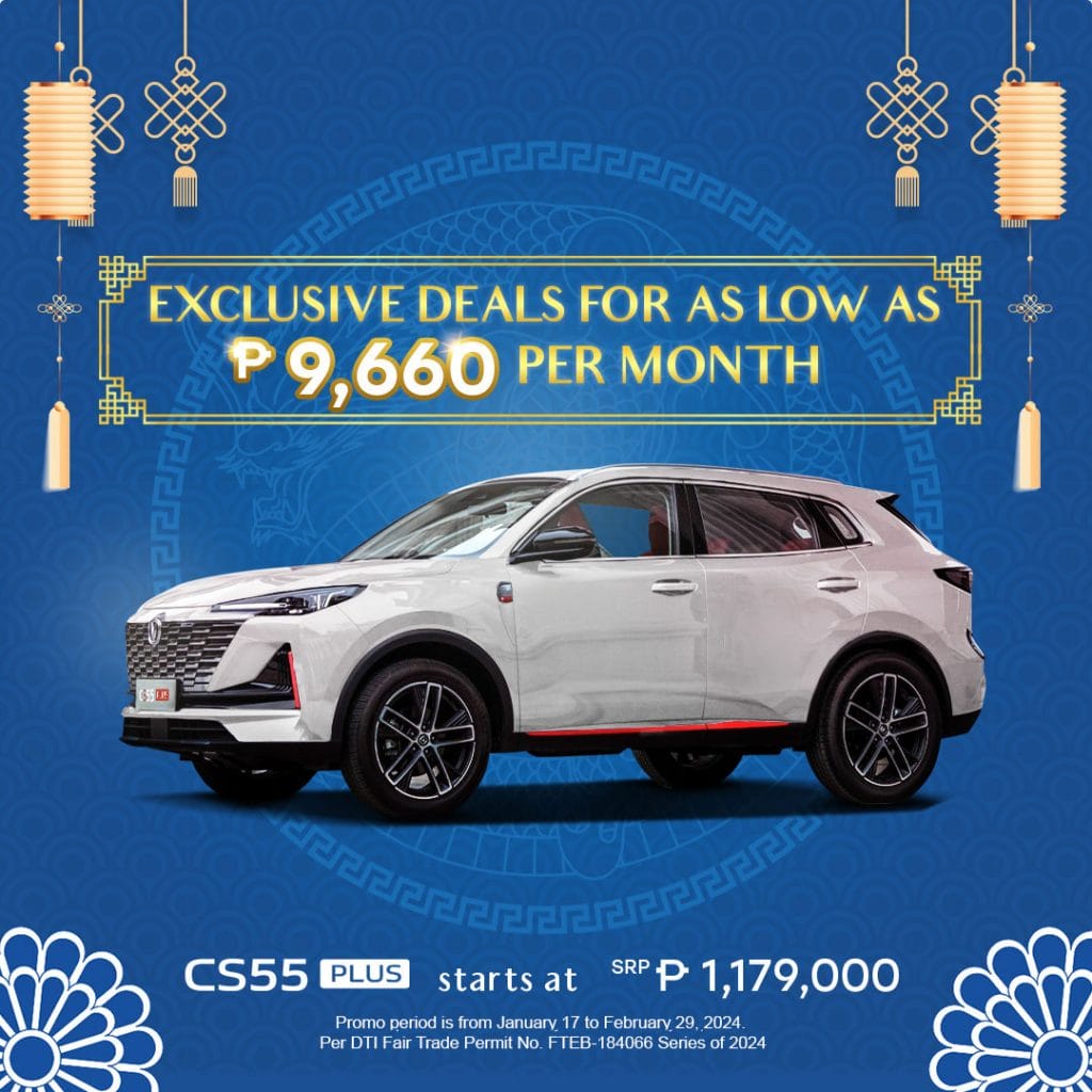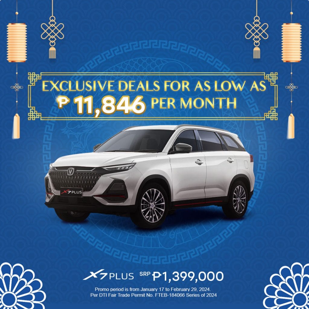 Drive home your brand-new ride with Changan New Year Festival exclusive offers! Alsvin sedan for Php5,594 monthly, CS35 Plus for Php9,939 monthly, CS55 Plus for Php9,660 monthly, Uni-T for Php14,226 monthly, Uni-K for Php23,358 monthly, and the 7-seater X7 Plus for Php11,846 per month! Drive to prosperity this Lunar New Year!