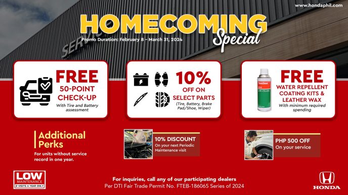 Make sure your Honda is in tip-top shape and save some money too! Honda Cars Philippines is offering a Service Homecoming Special Promo to all its customers with great deals and freebies. Haven’t had your car checked in a year or more? This one is for you! Read on to find out about our Service Homecoming Special, available until March 31, 2024.