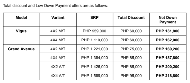 JMC is offering an introductory discount for all variants of the Grand Avenue and Vigus. Customers can enjoy PHP 75,000 up to PHP 95,000 off the SRP for the Grand Avenue 4×2 and 4×4 variants. JMC also offers PHP 60,000 off the SRP for the Vigus 4×2 MT and 4×4 MT variants.