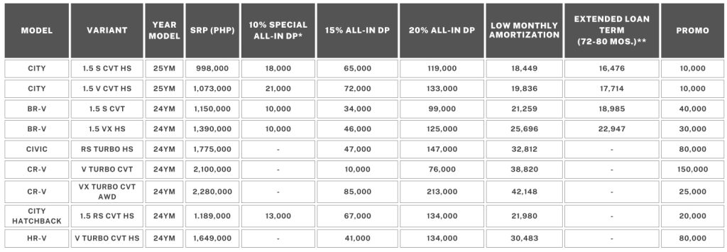 Honda Cars Philippines, Inc. (HCPI) has announced the extension of its ‘Drive in Style’ promo with updated deals for the month of September. The Honda CR-V V Turbo CVT is more attainable than ever with a PHP 150,000 markdown, bringing its price down to only PHP 1,950,000. The City S 1.5 CVT also gets a special promo, with a special all-in down payment of PHP 18,000. Also discounted this month are the Civic RS Turbo CVT Honda SENSING, HR-V V Turbo CVT Honda SENSING, BR-V 1.5 S CVT.