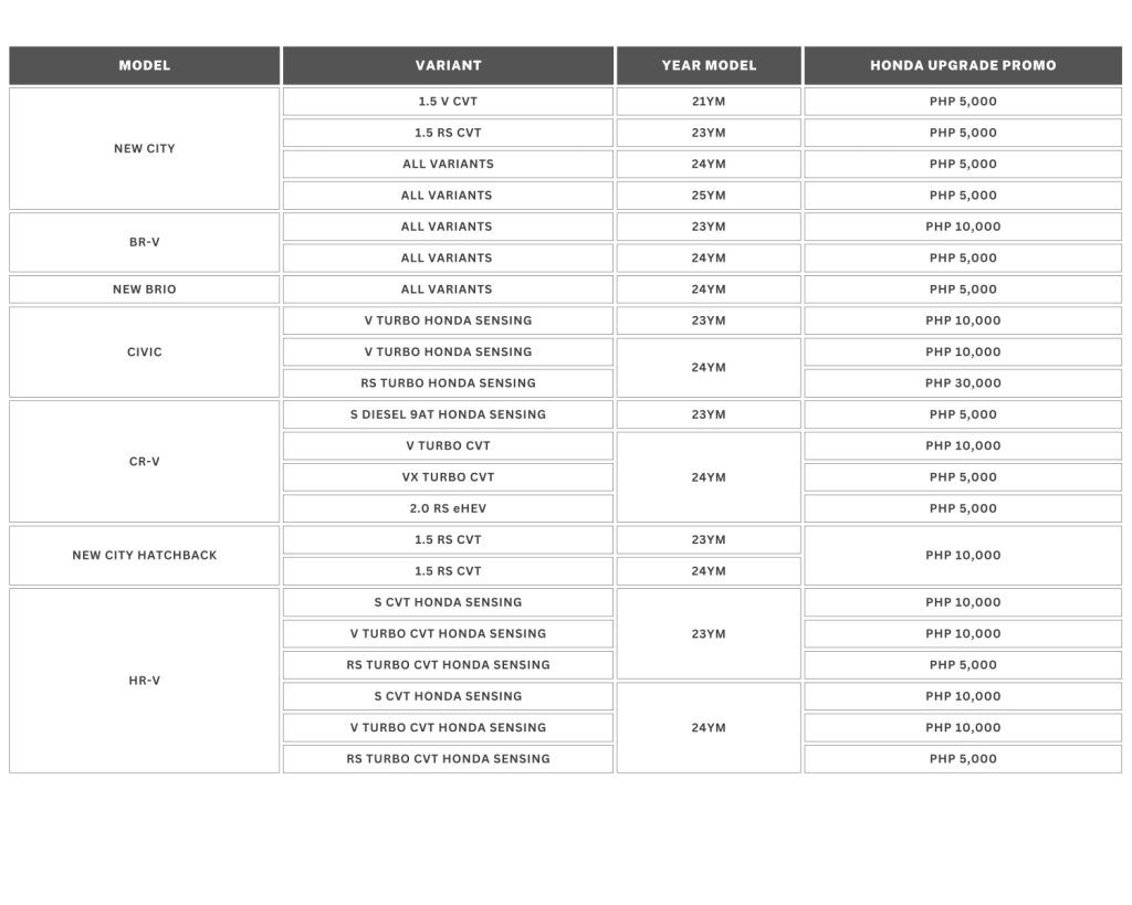 Deciding if it’s time to replace your current Honda with a newer one? The Honda Upgrade Program (HUP) is here to make the choice easier. This month, the upgrade to a Civic RS Turbo Honda SENSING is made lighter with a combined PHP 110,000 discount*. All HUP offers can be combined with other existing offers for the month.