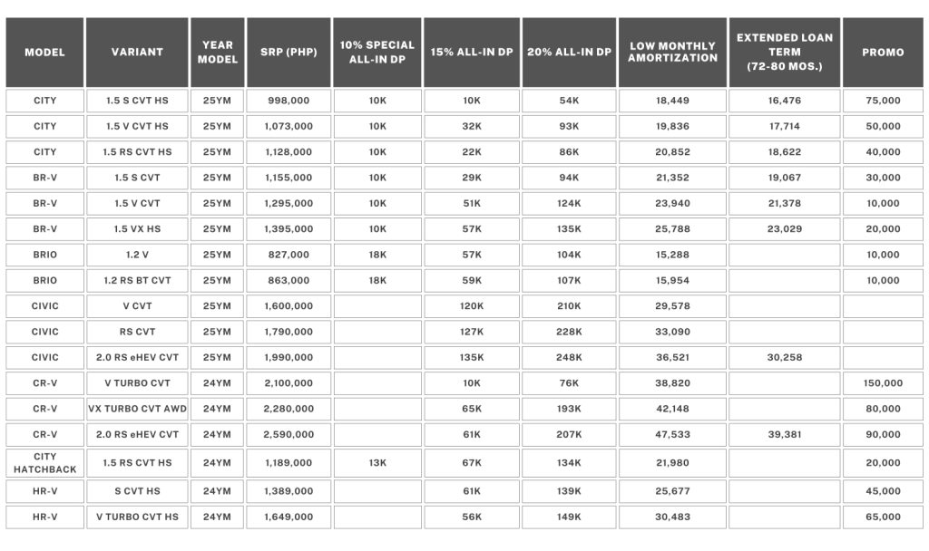 2. Low Cash-out and Low Monthly Amortization All-In Bundle applicable for current e:HEV models: Customers are entitled to 15% or 20% down payment for 36 to 60 months. Moreover, discounts can be applied to lower the down payment. Fifteen Percent (15%) down payment is not applicable to PSBank. This is subject to bank approval.