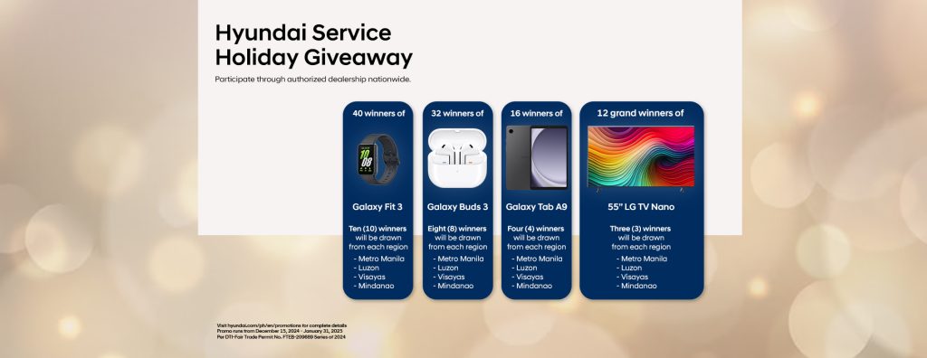 Hyundai Motor Philippines Inc. (HMPH) celebrates the holiday season alongside its loyal customers through its Hyundai Service Holiday Giveaway promo. 100 exclusive prizes will be raffled off to Hyundai owners who bring in their vehicles for service at authorized Hyundai Service Centers until January 31, 2025.