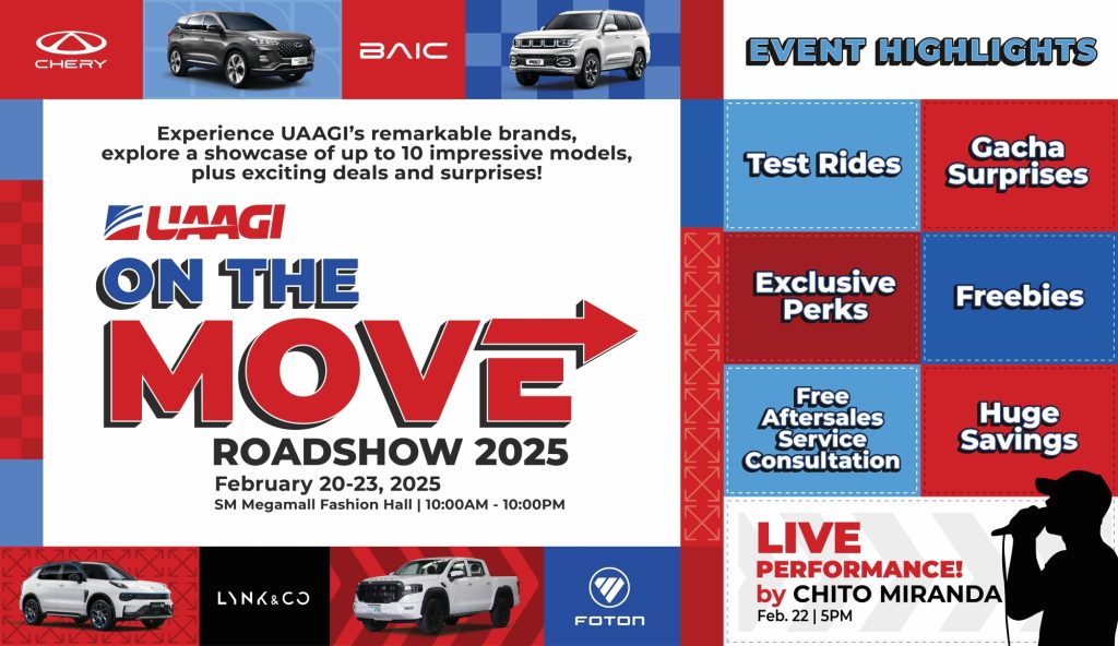And for this weekend only, you can avail of additional discounts on select Lynk & Co models! Visit the UAAGI On The Move roadshow tour at the SM Megamall Fashion Hall from February 20-23, 2025. Visit the Lynk & Co: Space one-stop-shop to experience our luxurious and modern vehicle lineup, and take a test ride to feel the new, global, premium difference with these Swedish-designed and -engineered rides. Reserve, purchase, or get approved for bank financing and be eligible for up to an additional Php 25k cash discount on select Lynk & Co models. Plus, enjoy a free, special performance by Chito Miranda of Parokya ni Edgar when you visit UAAGI On The Move on Saturday, February 22, at 5 pm!