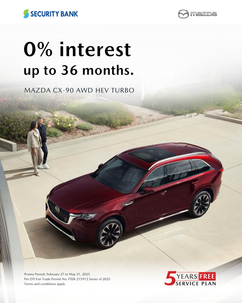 Drive home the Mazda CX-60 HEV for as low as ₱38,750 per month or the Mazda CX-90 for as low as ₱51,111, based on a 50 percent down payment. All financing applications are subject to Security Bank’s evaluation and approval.