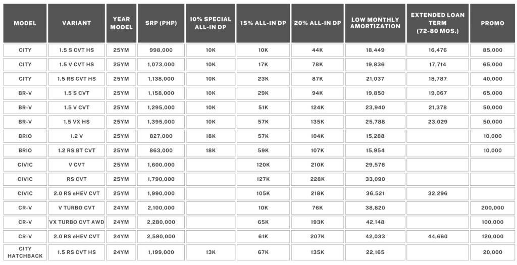 - Low Cash-out and Low Monthly Amortization All-In Bundle applicable for current e:HEV models: Customers are entitled to 15% or 20% downpayment with 60 months to pay. Fifteen Percent (15%) downpayment is not applicable to PSBank.
