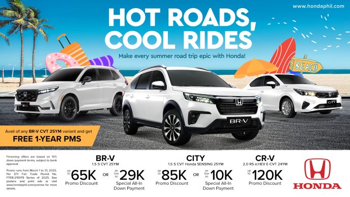 Prepare to hit the road with a cool new ride from Honda Cars Philippines, Inc. (HCPI) this month. From March 1-31, 2025, get as much as PHP120,000 discount on a new CR-V RS e:HEV E-CVT, avail free 1-year preventive maintenance services (PMS) on any BR-V CVT 25YM variant, or select between PHP85,000 off or PHP10,000* all-in downpayment for a City 1.5 S CVT Honda SENSING.