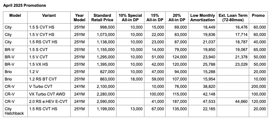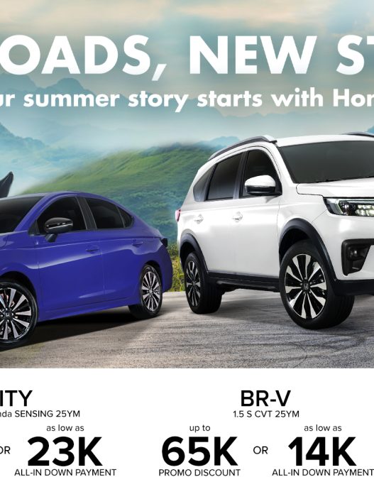 Drive into summer withthe continuation of Honda Cars Philippines, Inc. (HCPI) “Hot Roads, Cool Rides” promo. From April 1-30, 2025, customers can get as much as PHP120,000 discount on a new CR-V 2.0 RS e:HEV E-CVT, save PHP65,000 on a new BR-V 1.5 S CVT, avail PHP40,000 off on a new City 1.5 RS CVT Honda SENSING, or choose between PHP20,000 off or PHP22,165* low monthly amortization for a new City Hatchback 1.5 RS CVT Honda SENSING.