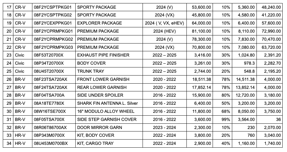 Conveniently store luggage and travel needs in the car, whether wet or dry, by getting a trunk or cargo tray for a Honda City (2021-2025 year model), a Honda Civic (2022-2025 year model) or a Honda HR-V (2022-2024 year model), which are currently sold at a discount of up to 40%. Add more style and sportiness on a Honda vehicle with Honda Genuine Accessories, and save as much as 99% off this month.