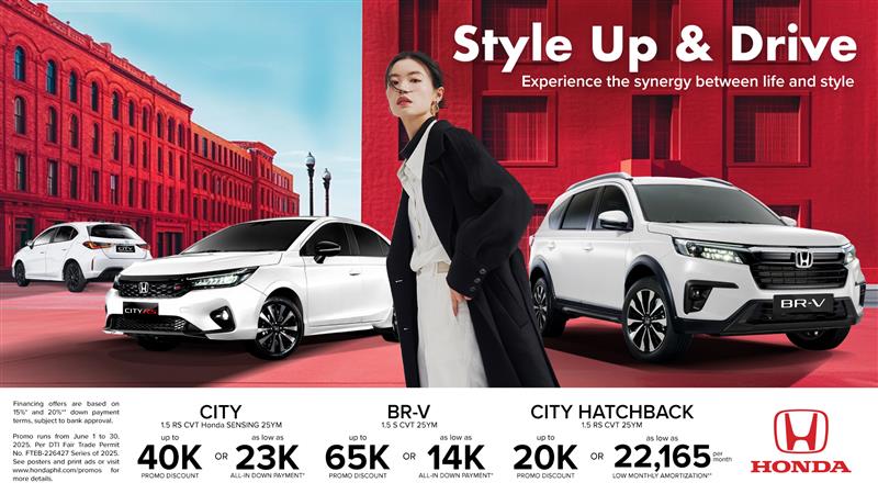 Radiate confidence when cruising in style as Honda Cars Philippines, Inc. (HCPI) launches its “Style Up & Drive” promo. From June 1-30, 2025, customers may enjoy special discounts, avail all-in downpayment offers and take advantage of low monthly amortization for a City 1.5 RS CVT Honda SENSING, City Hatchback 1.5 RS CVT Honda SENSING, BR-V 1.5 S CVT and CR-V 2.0 RS e:HEV E-CVT.