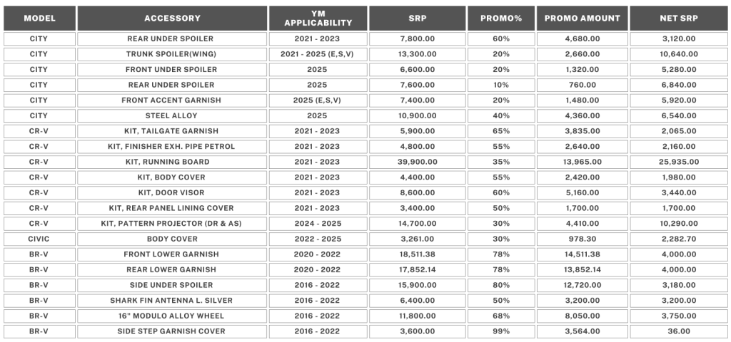 Customers looking to style up their Honda cars may save up to PHP 14,500 this month on various accessories listed below.