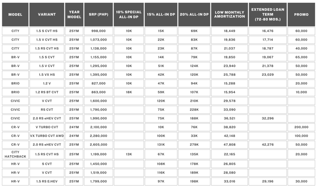 - Low Cash-out and Low Monthly Amortization All-In Bundle applicable for current e:HEV models: Customers are entitled to 15% or 20% downpayment with 60 months to pay. Fifteen Percent (15%) downpayment is not applicable to PSBank.