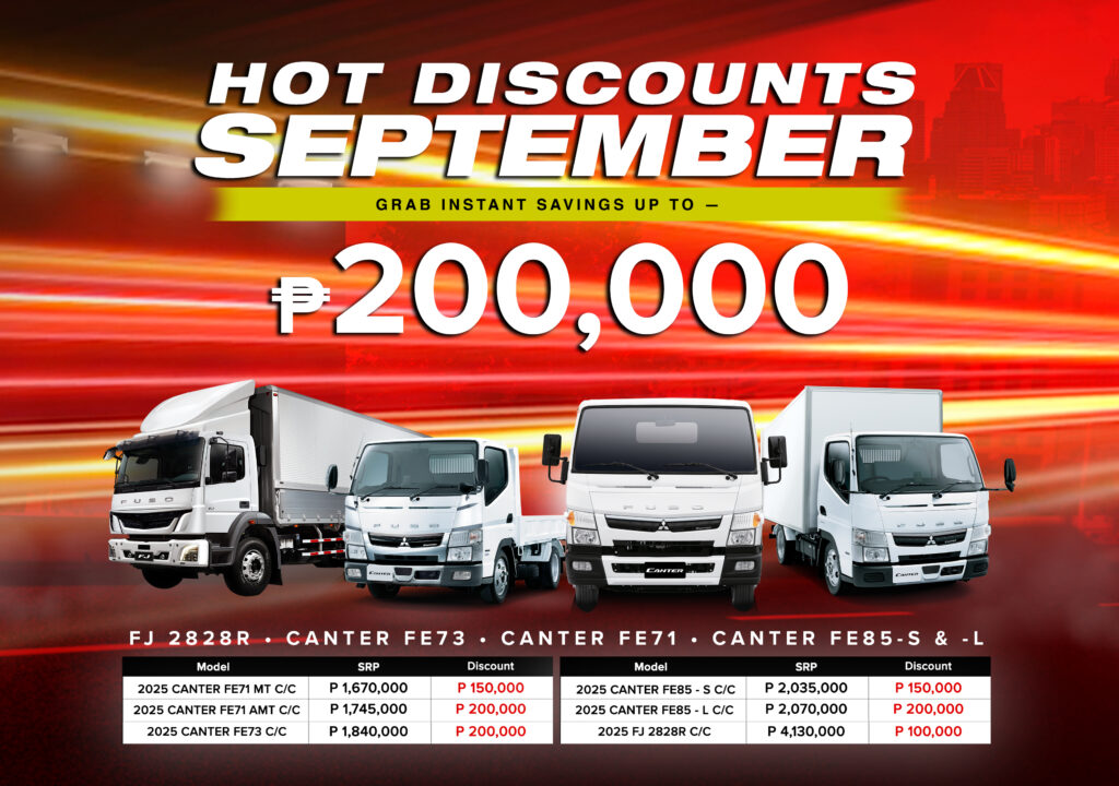 Sojitz Fuso Philippines Corporation (SFP) launched its Hot Discounts September Promo, offering Filipino customers the chance to enjoy instant savings of up to ₱200,000 on select FUSO models.
