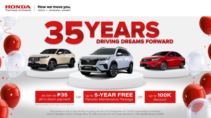 Honda Cars Philippines, Inc. (HCPI) celebrates 35 years in the country and extends the celebration to Filipinos by offering exciting anniversary deals with its “35 Years: Driving Dreams Forward” promo. From October 18-31, 2025, customers can select between getting downpayment as low as PHP 35, availing up to 5 Years Free Periodic Maintenance Service (PMS) or enjoying as much as PHP 100,000 cash discount, when purchasing select City, BR-V or HR-V variants.