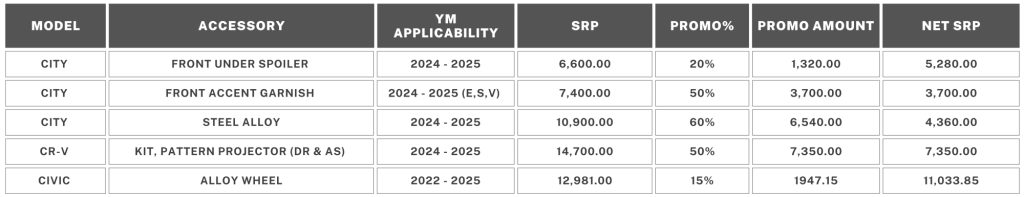 HCPI is also offering special deals on Honda Genuine Accessories for the month, perfect for every Honda owner looking to customize their cars. Gift a Honda Genuine Accessory for as low as PHP 3,700.