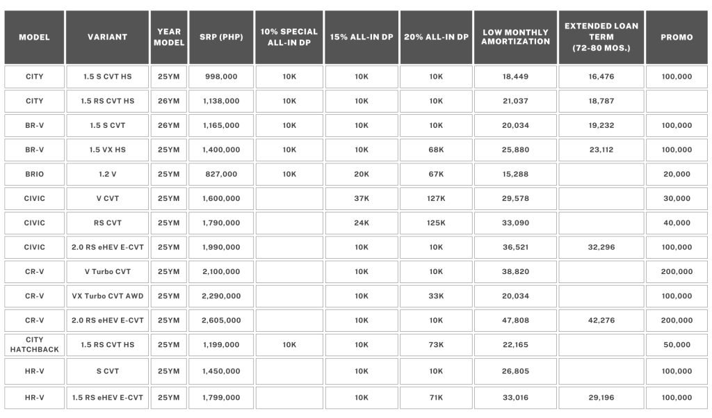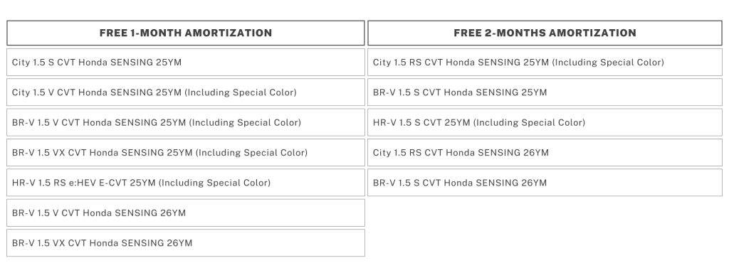 Introduced last month, the Drive Today, Pay Next Year program allows customers to avail up to two (2) months of free amortization through participating bank partners – BPI and RCBC. This offer is inclusive of the all-in package* and applicable only through 15% or 20% all-in low cash-out financing scheme of over five (5) years or sixty (60) months. As a bonus, this program is now extended to the BR-V 1.5 S CVT 26YM, BR-V 1.5 V CVT 26YM, BR-V 1.5 VX CVT 26YM and City 1.5 RS CVT Honda SENSING 26YM, which is available only until December 31, 2025.