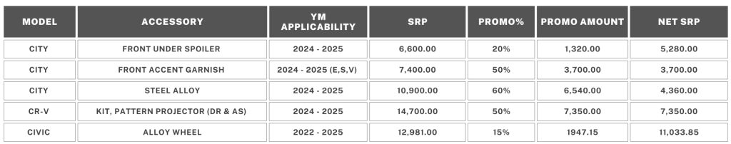 Individuals who already own a Honda vehicle can take advantage of HCPI’s special deals on Honda Genuine Accessories this December to personalize their vehicle. Furthermore, accessories make excellent gifts, with prices starting as low as PHP 3,700.