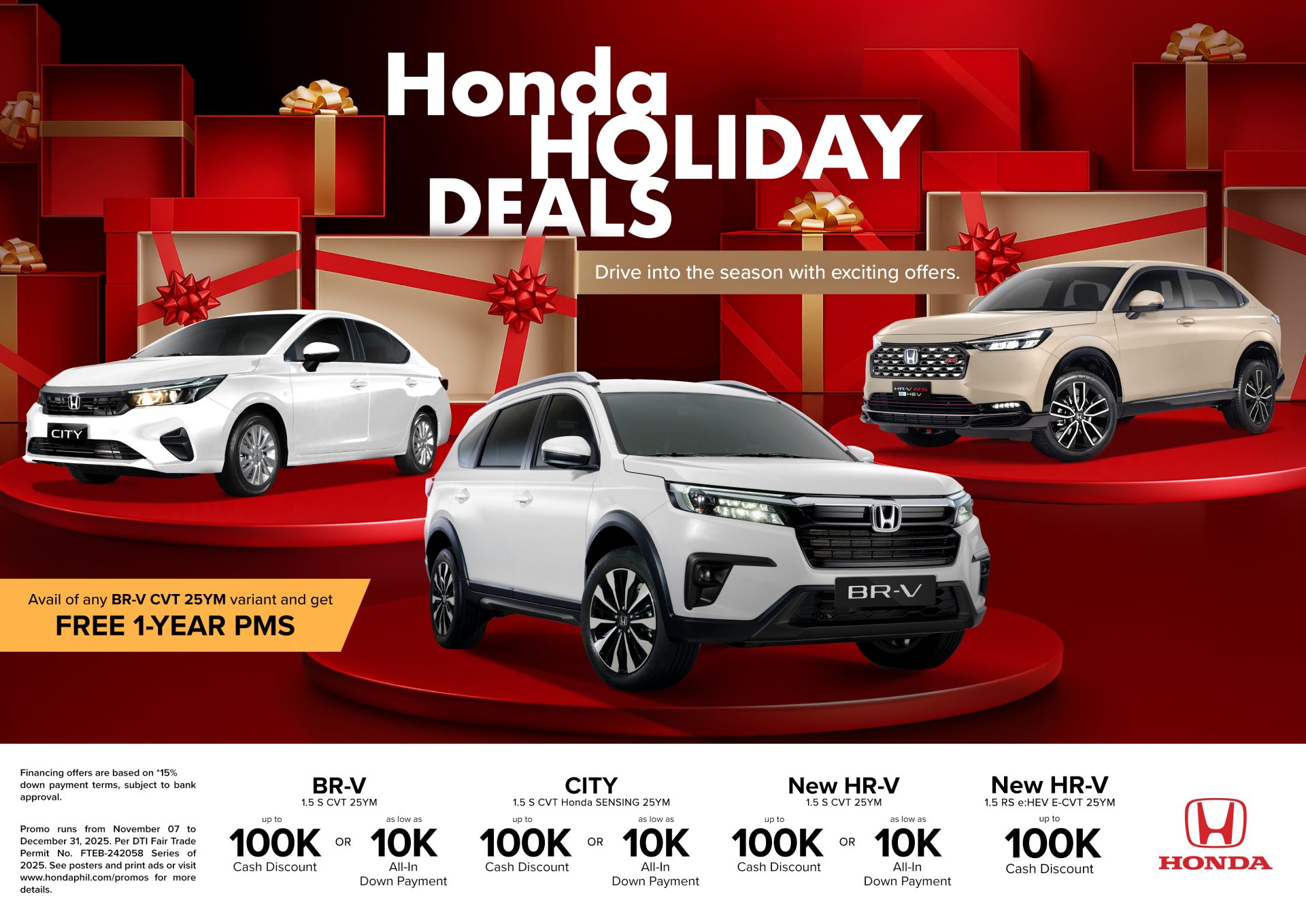 Honda Cars Philippines, Inc. (HCPI) continues its “Honda Holiday Deals” this December, inviting customers to unwrap the season with a brand-new City, BR-V or a range of other exciting Honda vehicles. This season of giving, HCPI makes driving a dream Honda as easy as ABC with the following options: