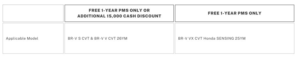 - BR-V 1.5 VX CVT Honda SENSING 25YM – PHP 100,000 off or PHP 10,000 all-in downpayment based on 15%