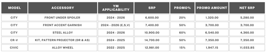 Every brand new and existing Honda car can be equipped with Honda Genuine Accessories to add a special personal touch. The following accessories are discounted for up to PHP 7,350 this month:
