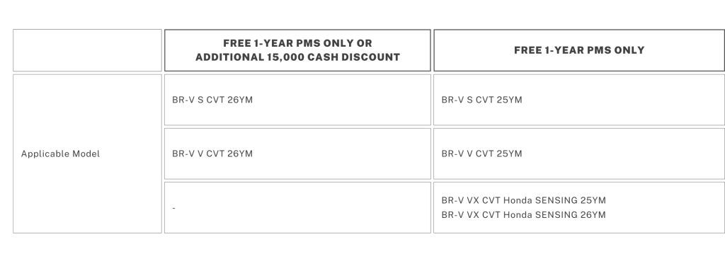 On top of these special promos for the BR-V, customers can enjoy Free 1-Year Periodic Maintenance Service (PMS) or additional PHP15,000 cash discount, depending on the BR-V unit purchased: