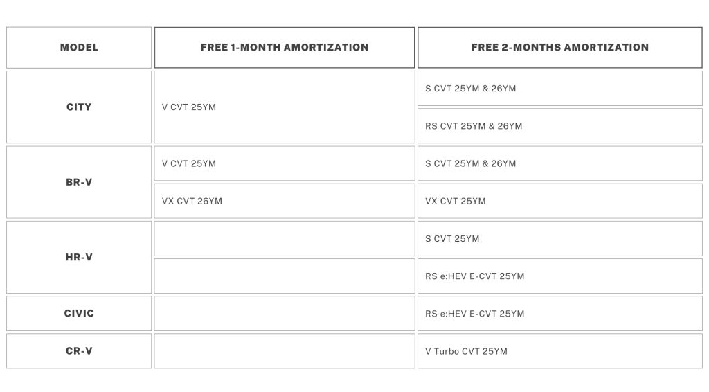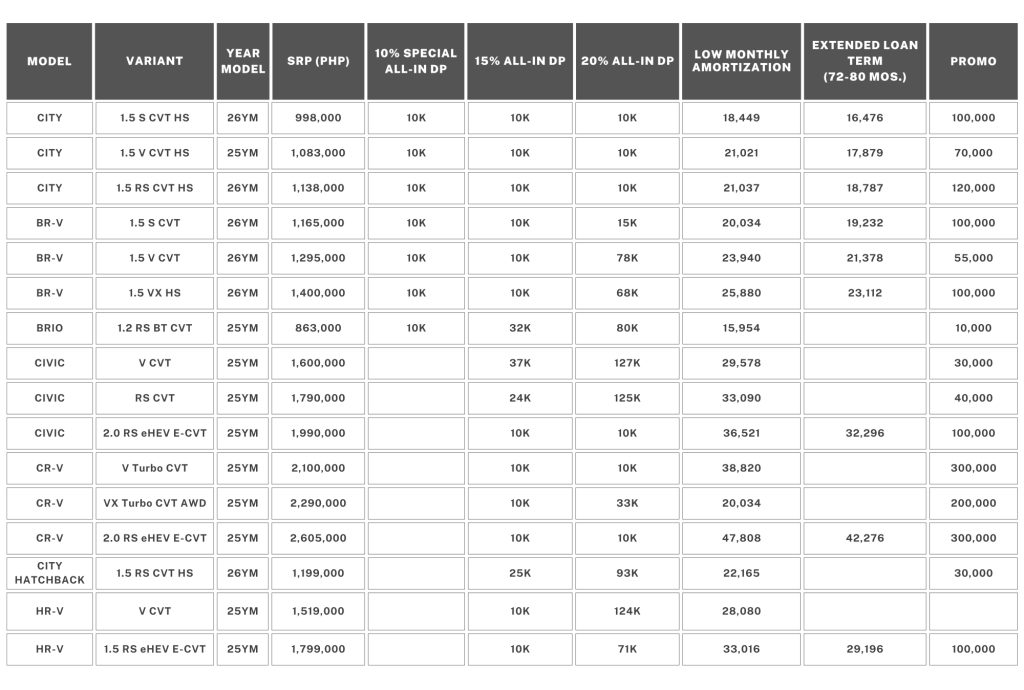 Continuously offering flexible ways to own a Honda, HCPI extends its Drive Today, Pay Later until March 31, 2026. This promotion allows customers to avail up to two (2) months of free amortization through participating bank partners – BPI and RCBC. This offer is inclusive of the all-in package* and applicable only through 15% or 20% all-in low cash-out financing scheme of over five (5) years or sixty (60) months.
