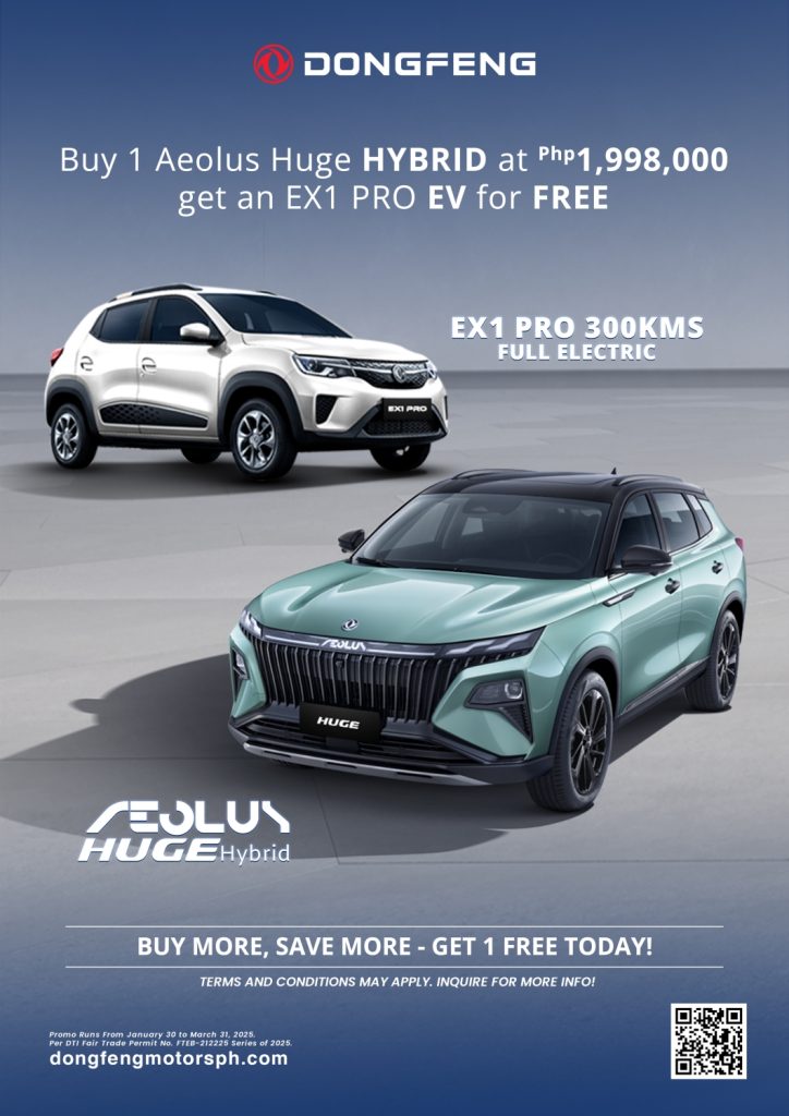 For a limited time, Dongfeng Motors Philippines is giving you an exclusive chance to own both the Aeolus Huge Hybrid and the EX1 Pro EV for just PHP 1,998,000. Yes, you read that right—two (2) vehicles, one (1) unbeatable price! But hurry, this offer is only available until March 31, 2025.