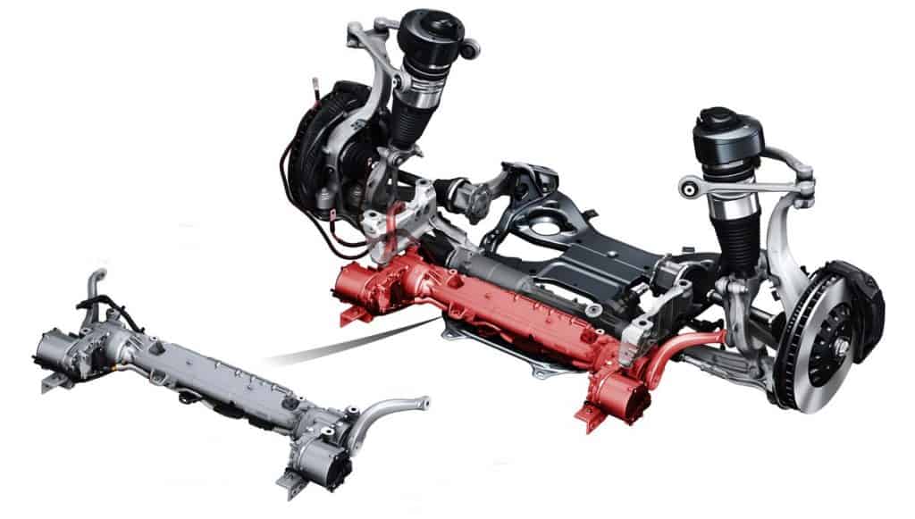 Allowing for this are compact electric motors located close to each of the Audi A8 L’s wheels, all of which are operated by the car’s 48-volt primary electrical system and governed by power electronics. A belt drive and a compact harmonic drive step up the electric motor’s torque almost 200 times, or to 1,100 Nm, and apply this to a steel rotary tube. The latter is permanently attached to a preloaded titanium rod located inside it and capable of turning through more than 20 degrees. From the end of the rotary tube, the force is transmitted to the suspension via a lever and coupling rod. At the front it acts on the spring strut while at the rear it works on a transverse link.