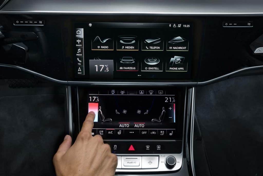 In the new Audi A8 L, MMI touch becomes MMI touch response. At the center of the car’s instrument panel is a 10.1-inch touchscreen display which, when switched off, blends almost invisibly into the high-gloss black surround because of its black-panel look. When the system is switched on, the user interface appears. Marked by new, concise graphics, the menu structure is intuitive and flat, like that of a smartphone’s, and its icons can be arranged according to user preference.