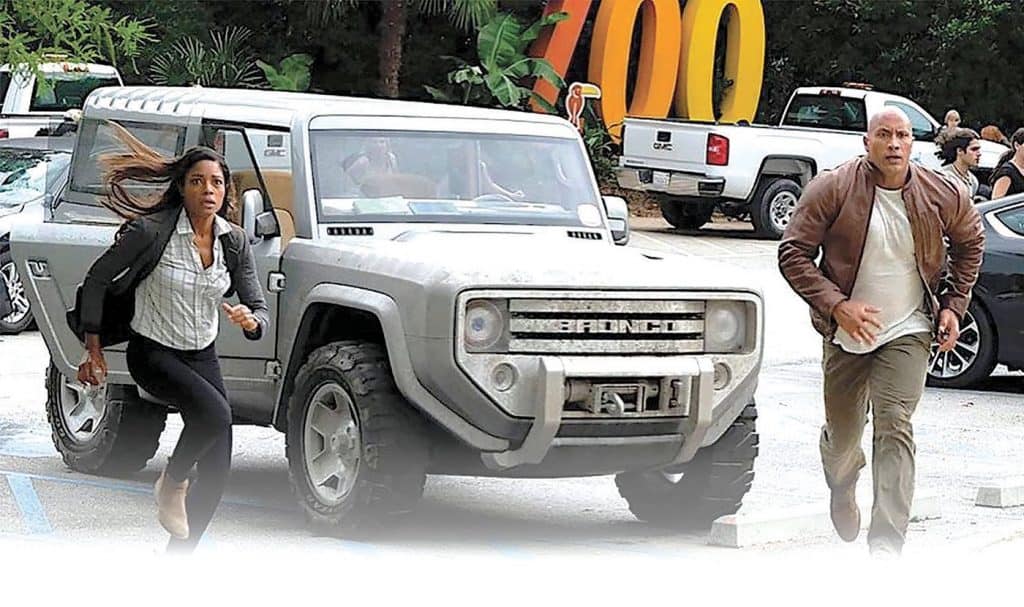 3. Few people probably realize that they might have seen the Bronco—or at least its retro-futuristic concept car version—in the 2018 Dwayne “The Rock” Johnson monster gorilla movie, Rampage. In the action flick, the character played by Johnson drives a dusty and unassuming-looking silver SUV that oddly looks like no other car you’ve seen. The Rock never refers to the vehicle nor even takes a look at it as he jumps out of it. Eagle-eyed viewers, however, will notice the “BRONCO” name on the grille.