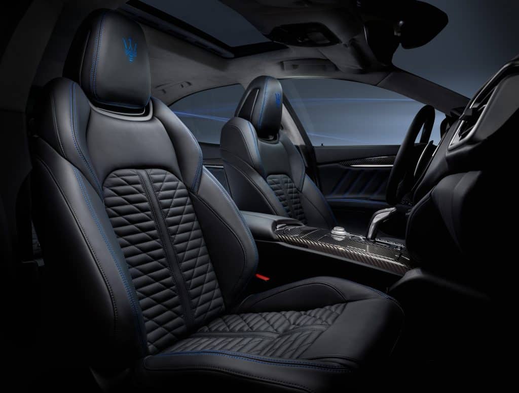 On the outside, the blue color characterizes the three iconic side air ducts, the brake calipers and the thunderbolt in the oval that encloses the Trident on the rear pillar. The same blue color appears inside the car, in particular on the embroidered seams of the seats.