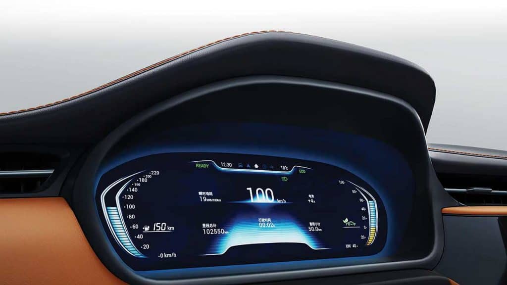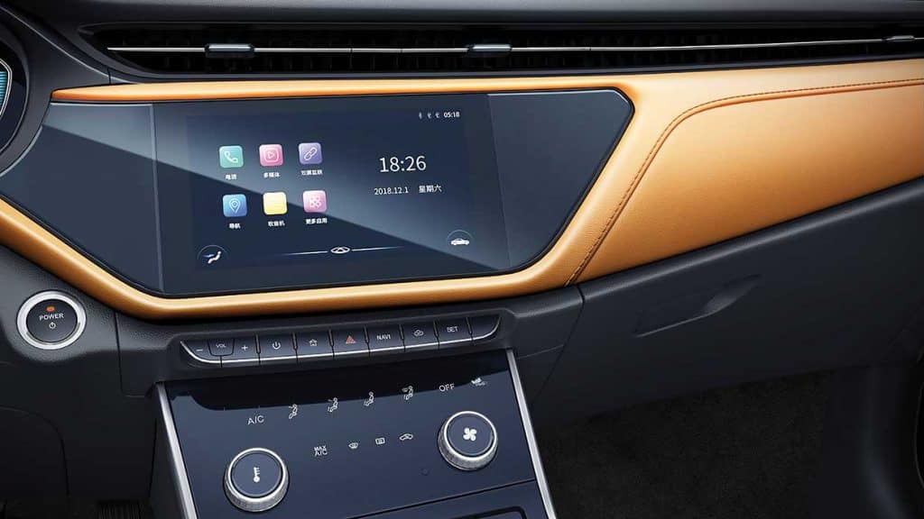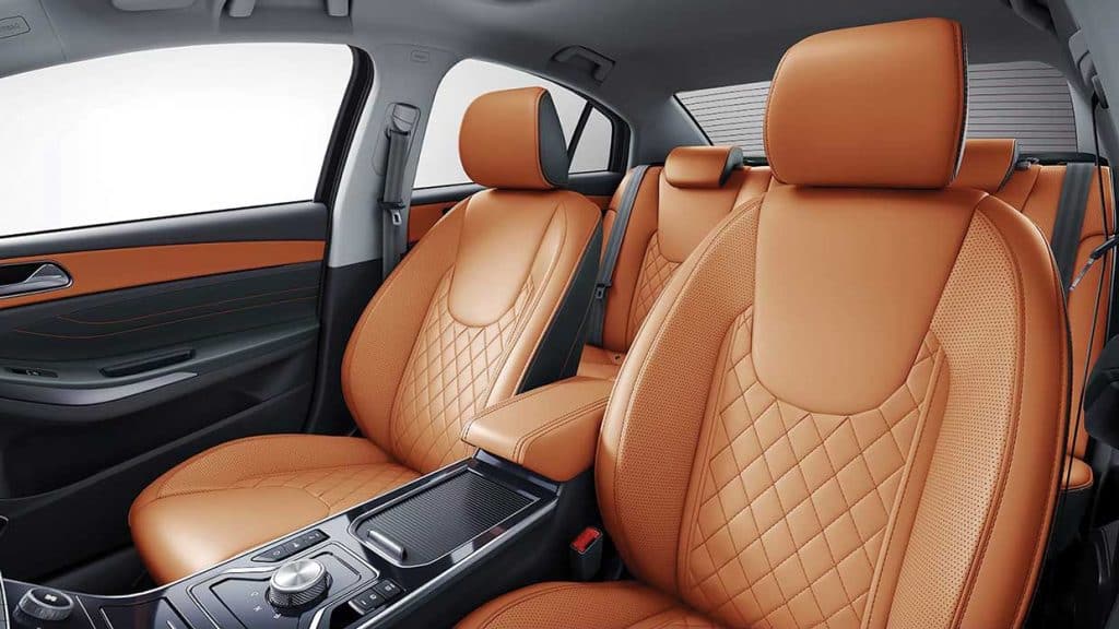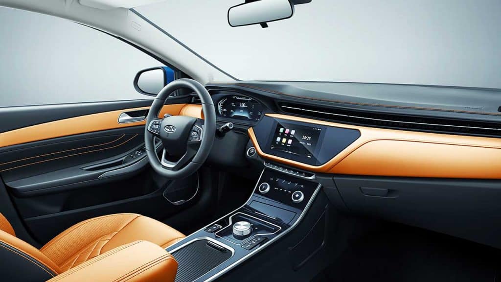 Inside the beautifully designed two-tone interior, you’ll find a large nine-inch touchscreen infotainment system on the central part of the gracefully curved dashboard. Below it is an eight-inch touch panel for the climate control — a very high-end touch. Unlike many mass-produced cars which uses lots of plastic in the interior, 65 percent of the Chery Arrizo 5e’s cabin is covered in leather.
