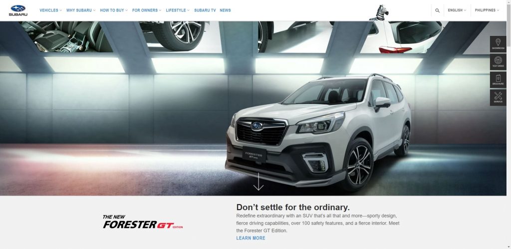 Subaru’s website let their images do the talking but there are a few interactive touches here and there. Their brochure needs your info, which I’m not a fan of, but it’s passable since the specs are complete on the car page alone. The prices are easily seen on the top menu and on a separate page, but not on the car pages itself, which is crucial specially for cars with multiple variants. They still prefer customers to test drive their cars before making a decision which explains why there’s no digital showroom or any payment schemes in their site.