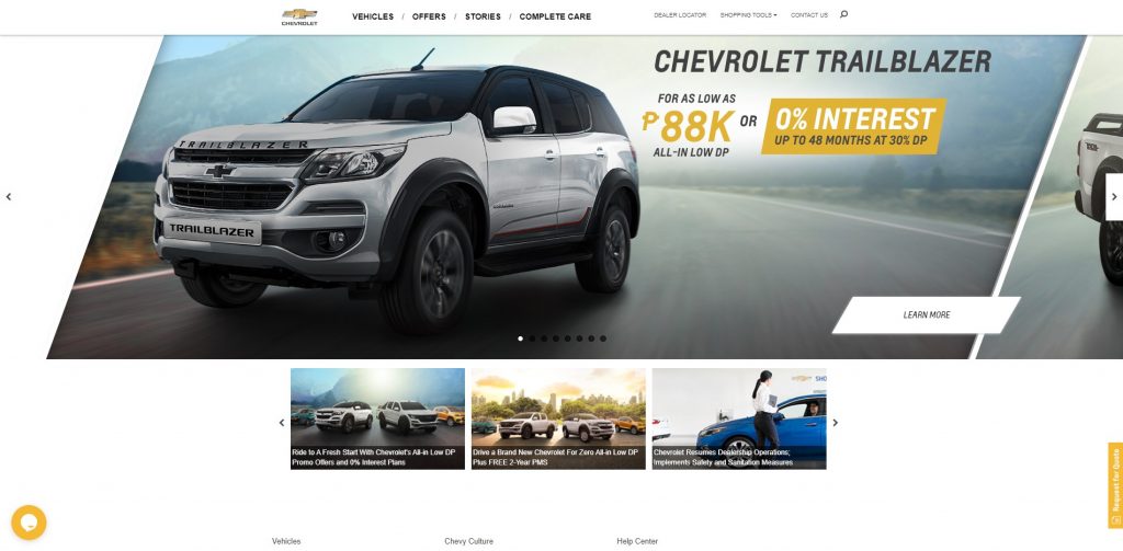 Chevrolet’s website looks good but not truly modern, with a very simple presentation all throughout. There are also a few pixelated images in some cars coupled with a few extra clicks to get around. The features are highlighted well and full specs are available but color previews are not available for all cars. The promos are presented early on, but further information regarding payment holds back the purpose of their “Shop.Click.Drive” program since that button (and their Ask Us button) goes to the same inquiry form.