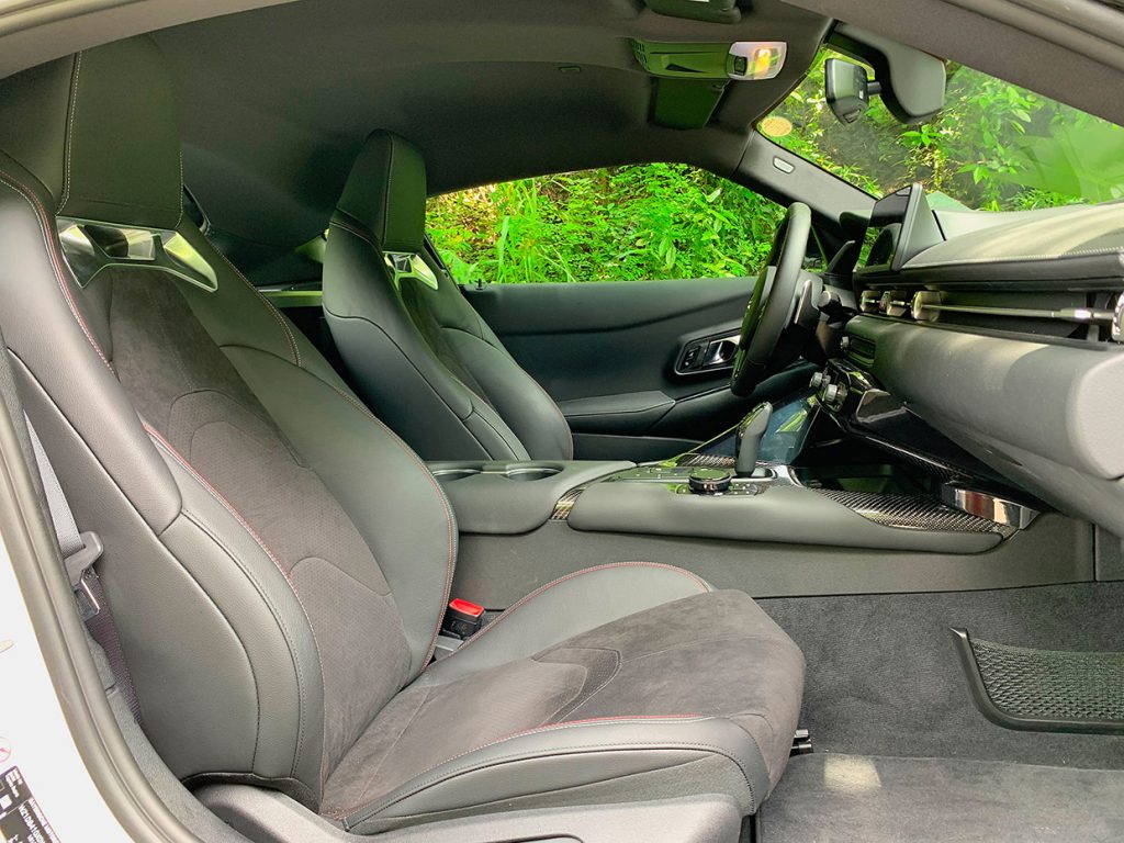 I love the Supra’s double-bubble roof, 6-lens auto-leveling LED headlights (three low beam, three high beam), the F1-inspired backup lamps (a series of 20 LEDs located in the center of the lower bumper), the signature rear LED lights, and the fixed ducktail rear wing. It is fitted with its own unique, more aggressive specification of Adaptive Variable Suspension, an electronic limited slip differential, painted-red four-pot Brembo calipers on 13.7-inch vented discs up front (the rears are 13.6-inch vented discs), handsome mixed forged alloys (9J x 19” front and 10J x 19” rear) wrapped with sticky 255/35R19 96Y front and 275/35R19 100Y rear Michelin Pilot Super Sport tires. It is stiffer than the Lexus LFA, and the center of gravity is lower than an 86. The combination of the superbly composed and balanced chassis, perfectly weighted steering, and decisive power delivery make the Toyota GR Supra an immensely satisfying driver experience.