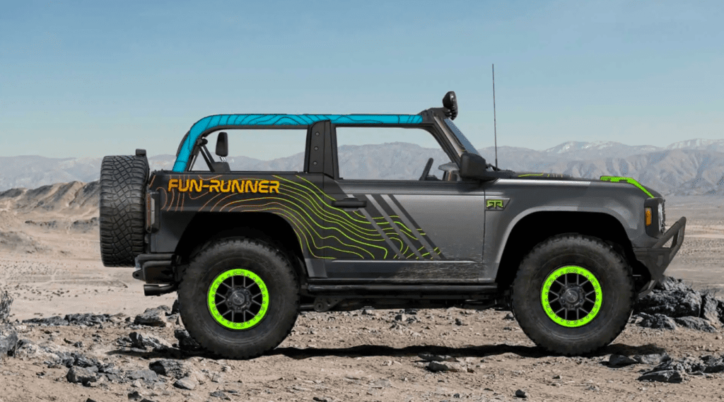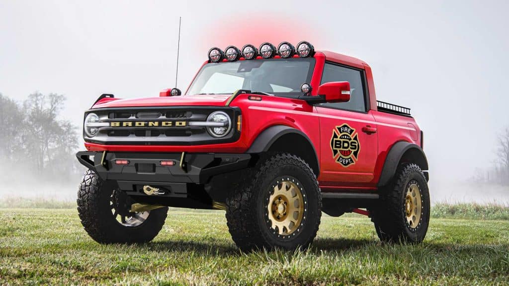 Most of the Ford Bronco creations come with suspension and wheel upgrades, such as the Bronco RTR Fun-Runner and Bronco/Bronco Sport Baja Forged by LGE-CTS Motorsports. However, BDS Suspensions went as far as modifying a two-door Bronco, turning it into a pickup truck equipped with search and rescue features like dual winches, custom bumpers with recovery hooks, an underhood air compressor, and lights galore.