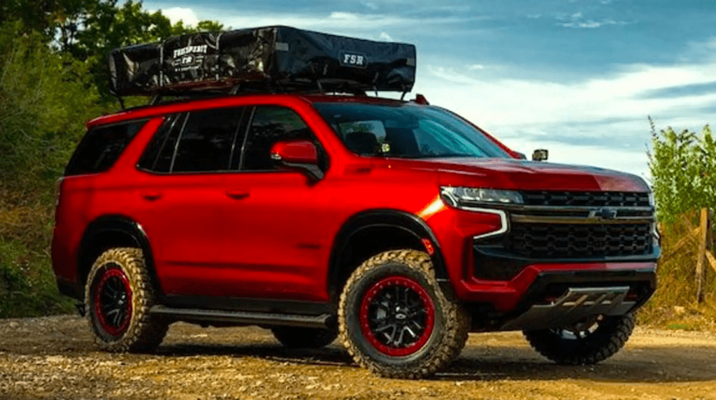 The Chevrolet Tahoe Z71 Overlanding Concept takes the full-size SUV and turned it into a rad off-roading menace, armed with air suspension with 18-inch beadlock wheels and 33-inch tires. It also comes with a rooftop tent for an option to stay outdoors at night.