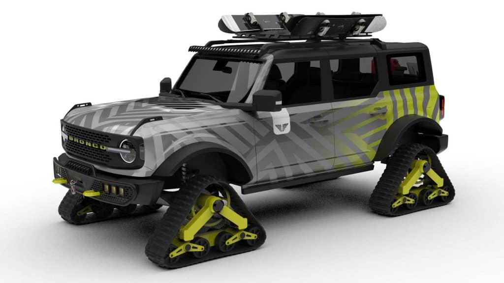 Ford’s main attraction is, of course, its most popular duo, the Bronco and the Bronco Sport. With a total of six builds coming from different aftermarket companies, the Bucking Horse gets more off-roading capability, more style, and in the case of the Tucci Hot Rods Bronco creation, a badass set of Mattracks 88-Series quad tracks.