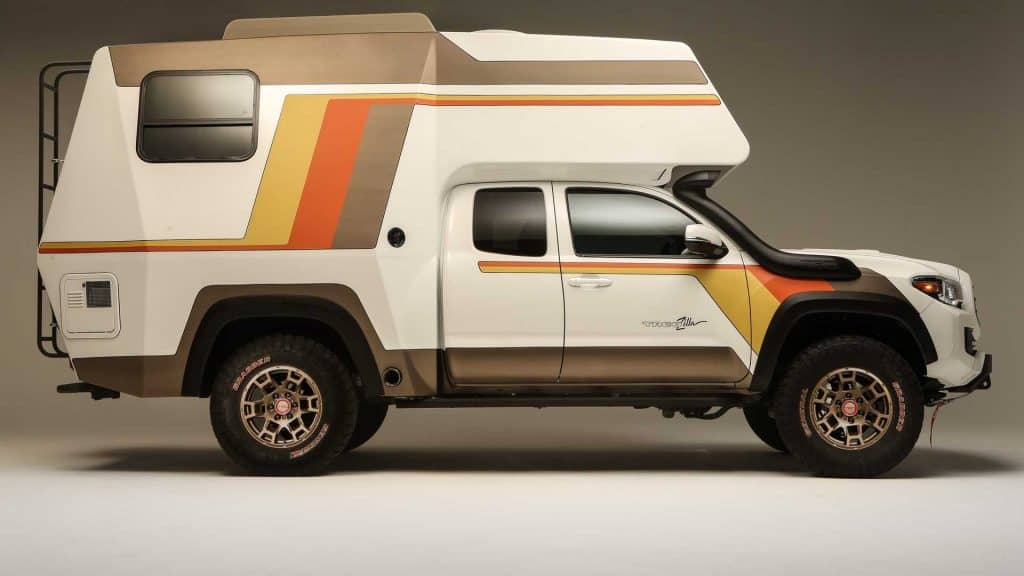 First of which is the Tacoma Tacozilla. The pickup-turned-camper is inspired by the Chinook campers of the ‘70s and ‘80s, taking the retro-licious look and applying the styling to modern times. Inside, it has everything including the kitchen sink, along with a fully insulated interior, teak sauna-style flooring, a full bathroom with hot-water shower, a kitchen with a stove, and a 3D-printed dining table that converts to a backlit piece of wall art.