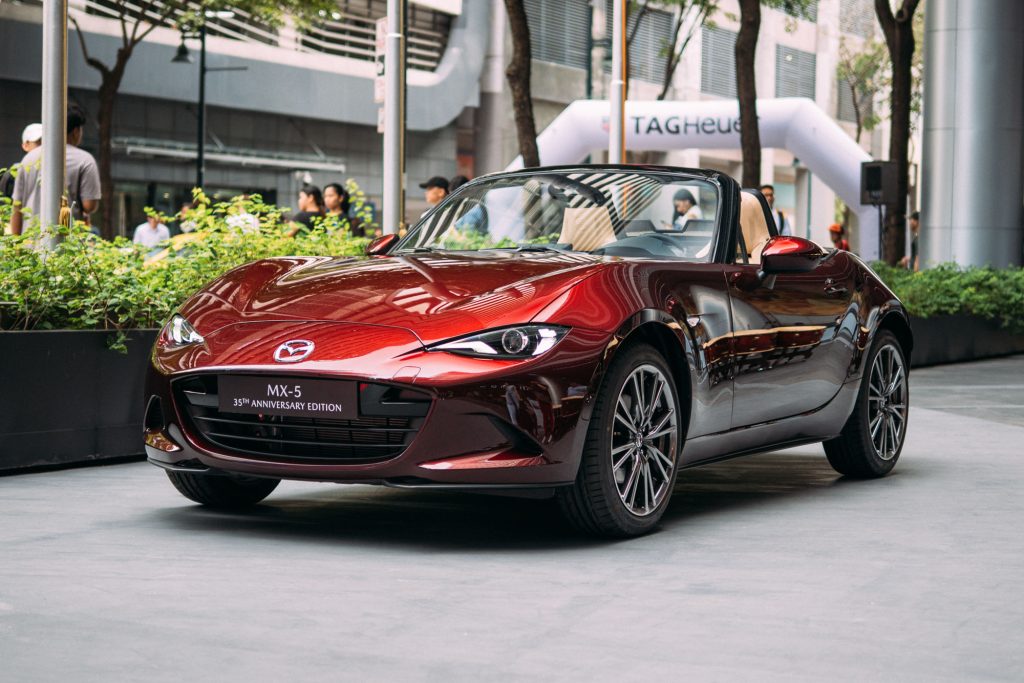 Limited to just 15 units in the country, the Mazda MX-5 35th Anniversary Edition commemorates more than three decades of the iconic lightweight sportscar from Mazda. The unmistakably sport silhouette comes with unique upscale touches, including the use of Artisan Red Premium Metallic for the first time on the MX-5. It also features tan Nappa leather upholstery as well.