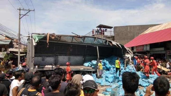 Authorities said that the truck was loaded with sacks of rice and was traveling along the diversion road around 9 a.m. when the driver lost control of its brakes — causing the trucks to plow through parked vehicles and pedestrians.